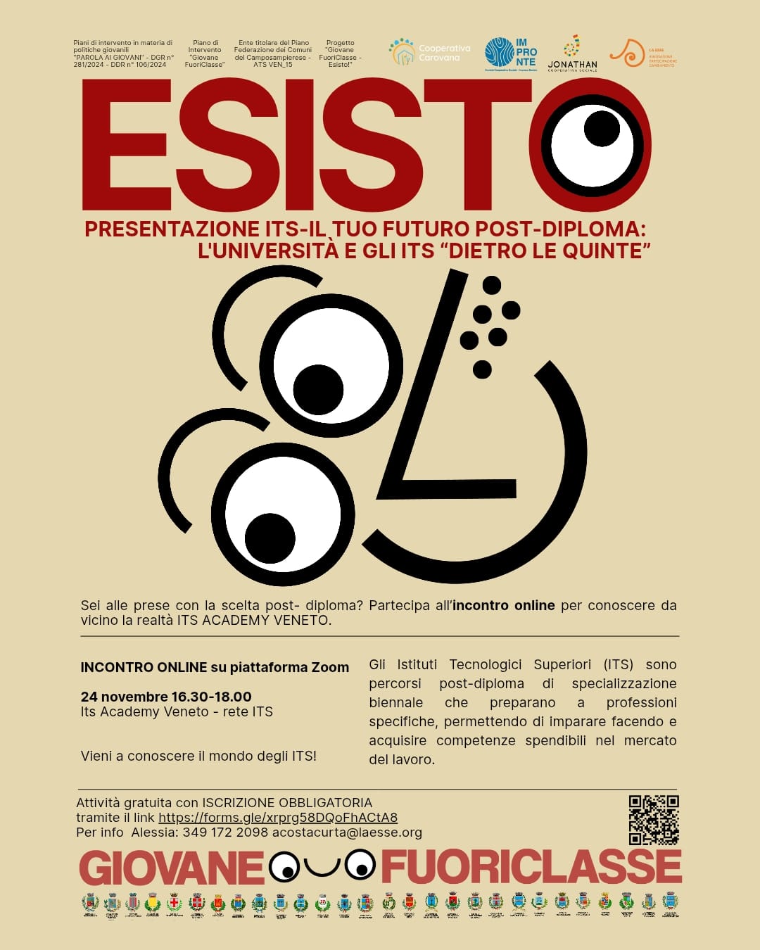 Nell'ambito del progetto ESISTO viene proposto l'ultimo incontro del ciclo di occasioni aperte ai giovani, gratuite e a portata di mano, pensate e realizzate in collaborazione con Istituti Universitari, ITS e studenti universitari, da titolo IL TUO FUTURO POST-DIPLOMA: LE UNIVERSITÀ E GLI ITS “DIETRO LE QUINTE”.
